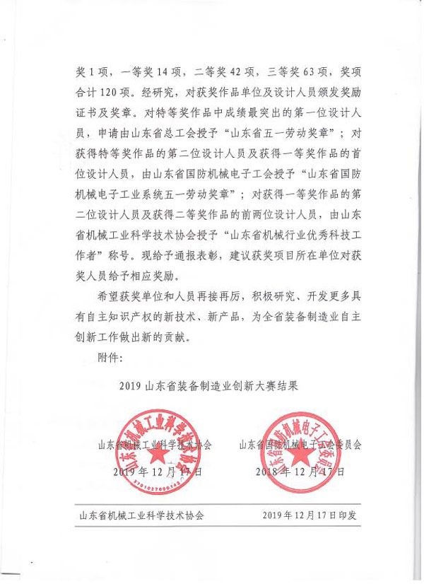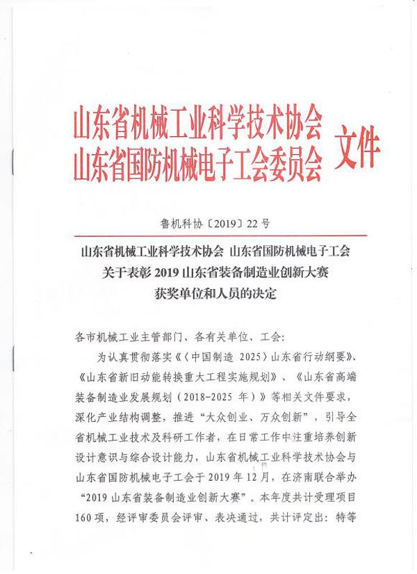 公司榮獲山東省裝備制造業創新大賽二等獎
